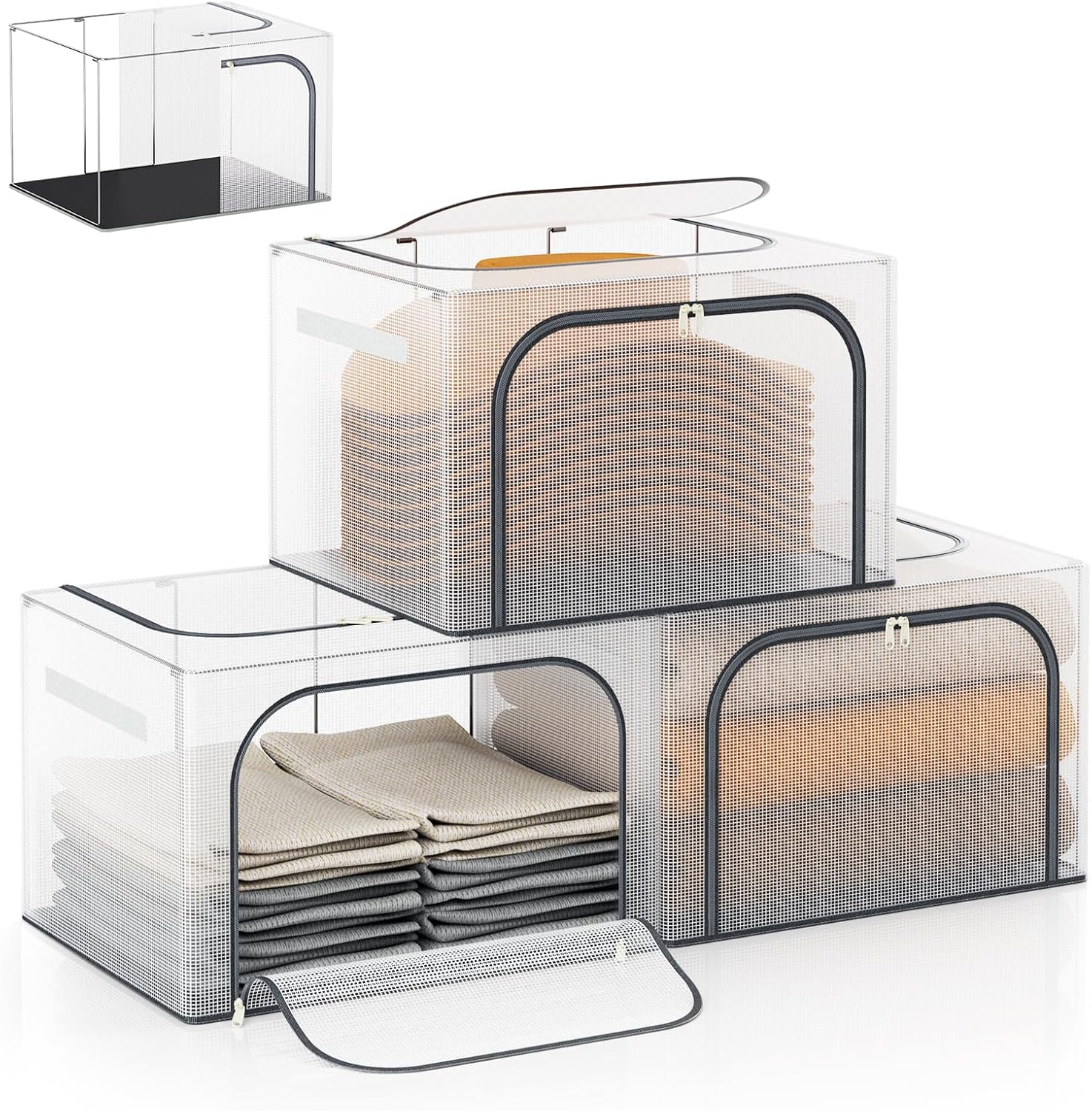 Large Size 66L 3 Pack Clothes Storage Bin with Metal Frame, Stackable & Foldable Box with Lids, Closet Organizers And Storage For Bedding, Cap, Sweater (Fully Transparent)